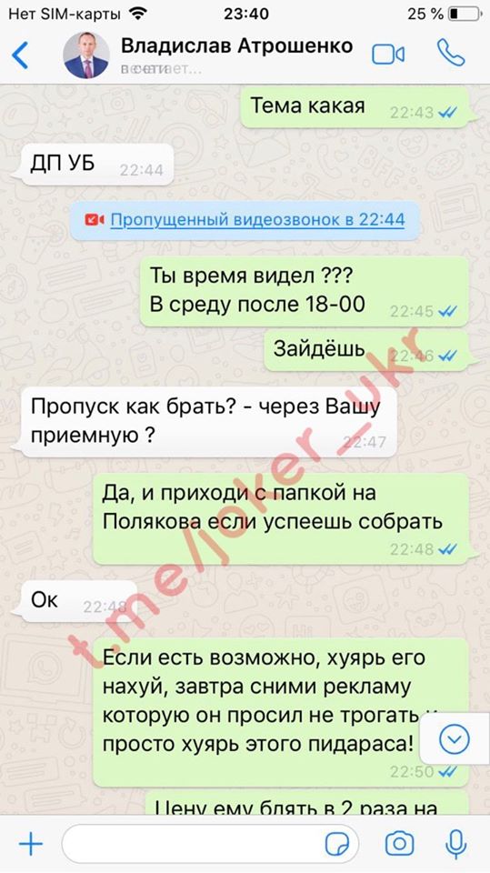 Після цього вже Атрошенко просить зустрічі із Богданом в Офісі Президента з приводу екс-нардепа за 206 округом Максима Микитася та домовляється про час зустрічі.