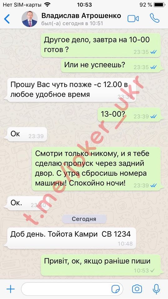 Також, за словами Атрошенка, на запитання у переписці відповідав не він, а його водій.