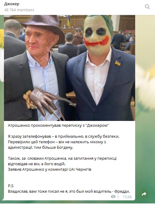 О 15.46 19-го листопада Джокер виклав фотку в телеграм де зображені персонажі Джокера та Фредді та написав: Владислав, вам тоже писал не я, это был мой водитель - Фредди.