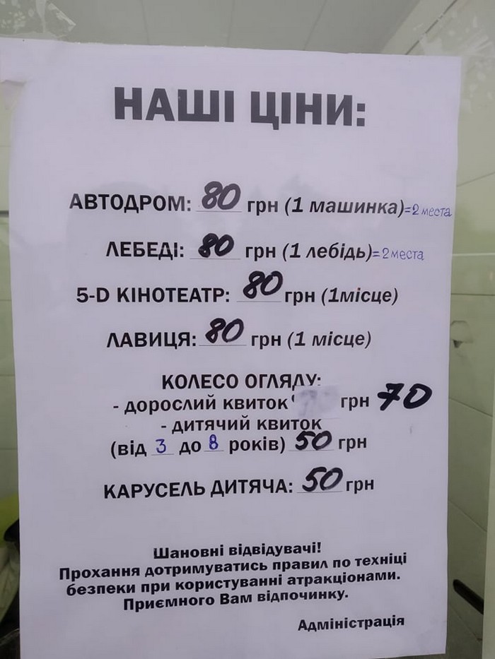 - Колесо обозрения: взрослый - 70 грн, детский (с 3 до 8 лет) - 50 грн⠀
