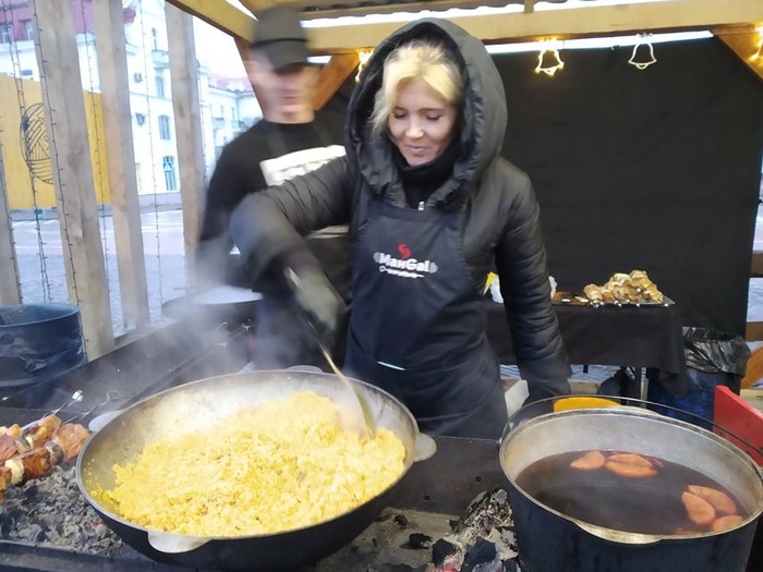«В основном берут картошку по-селянски, шашлык, колбаски, овощи к ним, глинтвейн, горячий шоколад. Вон плов у нас очень вкусный – порция 350 г стоит 40 гривен. Продуктов не жалеем, на этот казан только ушло 2 кг. мяса. Погода постоянно мешает торговле, очень слабо покупают. Идет дождь, снега нет, люди не хотят выходить гулять. У многих нет даже новогоднего настроения. Продавцов на площади гораздо больше, чем покупателей. Продавцы не дождутся, когда покупатель пойдет, заработка почти нет. Бывает в день даже не выходим на зарплату и аренду. Аренда дорогая, а людей в этом году нет», - утверждает Александр, который уже несколько лет в подряд торгует на площади в новогодние праздники.