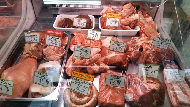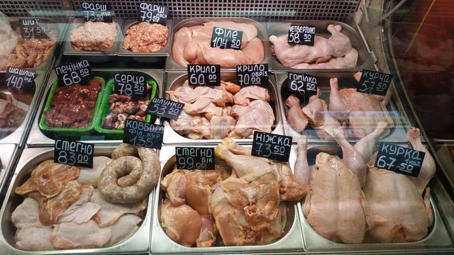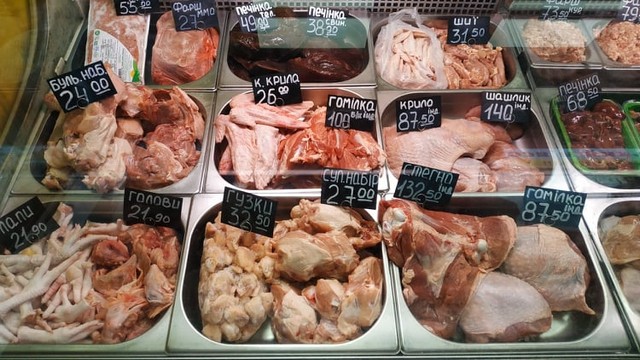 Переходим в мясной павильон. Здесь в продаже свиное, куриное и индюшиное мясо от известных украинских производителей. Свиной ошеек можно купить за 139 гривен/кг, подчеревок и бочок за 130, а свежее сало – за 60 гривен.