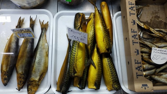 В рыбном павильоне жители микрорайона могут выбрать по своему вкусу свежемороженую, охлажденную, соленую и копченую рыбу. Также, в продаже есть кальмары, мидии и креветки.