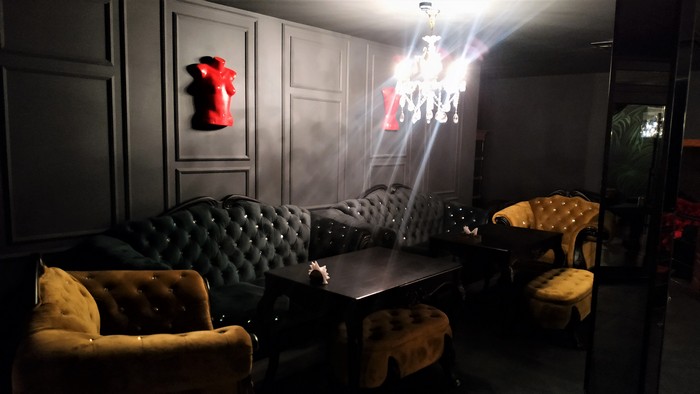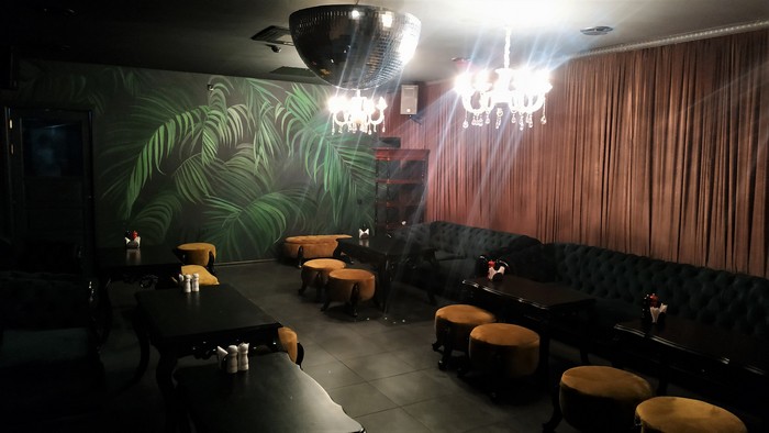 Далее следует холл с мягкими диванами, обтянутыми красным и черным плюшем, пуфами в стиле барокко, на фронтальной стене – силуэт девушки-кошечки, на боковой - висячие зеркала. Такие же мягкие диваны, пуфы, кресла и банкетки установлены в разных местах и внутри клуба. Перед диванами – низкие деревянные столики с изогнутыми ножками. На потолках – массивные люстры, но освещение приглушено для создания уютной, романтической атмосферы. В просторном зале есть танцевальная площадка для гостей, место для диджея, подиум, где девушки танцуют на пилоне и представляют яркое Pj-шоу. В центре – бар, который постепенно, с началом сезона наполняется самыми разными напитками.