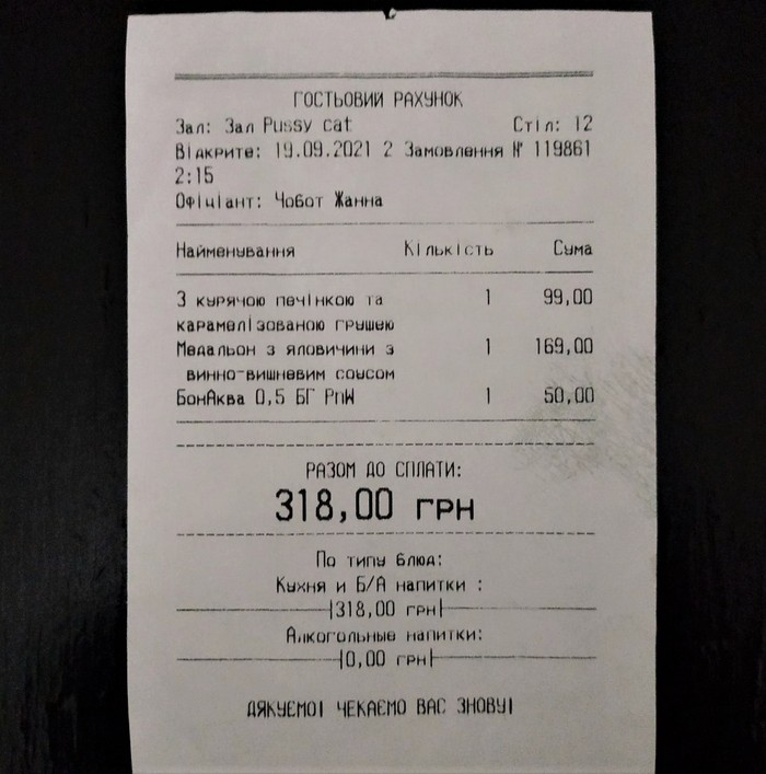 Средний чек на человека в «Pussy Cat» составляет 200-300 гривен. В клубе предусмотрен депозит в сумме 200 гривен, из которых на 100 можно заказать что-то из кухни и на 100 – в баре.