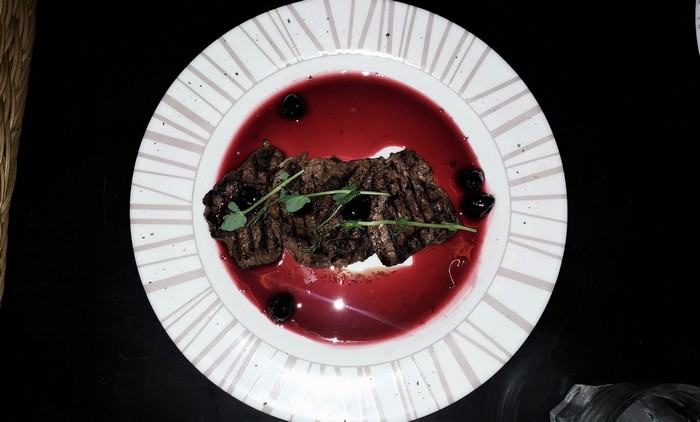 Официантка любезно помогла сделать выбор, учитывая наши предпочтения. Из горячего хотелось попробовать и рыбу, и мясо, поэтому мы заказали медальоны из говяжьей вырезки под винно-вишневым соусом (288 г/169 грн.) и стейк из лосося под сливочным соусом на основе морепродуктов (218 г/335 грн.) - самая дорогая позиция в меню заведения.