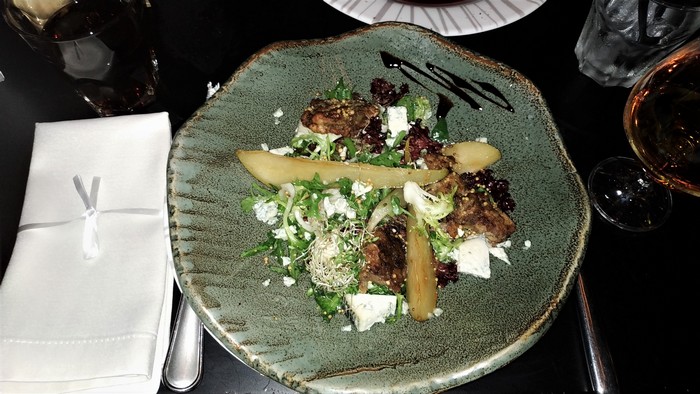 А, чтобы составить более-менее полное впечатление о меню, решили добавить в заказ еще и салатик с куриной печенью (258 г/ 99 грн.), и не прогадали, так как он оказался необыкновенно вкусным, несмотря на то, что в 2 раза дешевле, самого дорого собрата по меню - «С лососем от шефа» за 173 грн.. В состав салата с печенью, как позже рассказал шеф-повар, входят такие компоненты, как микс салат, карамелизированная груша, обжаренная печень, кусочки сыра Дорблю, заправленные классическим французским соусом «винегрет» (от французского слова vinaigre, что означает «уксус»). Соус винегрет – это салатная заправка, основными ингредиентами которой являются винный уксус, дижонская горчица и растительное масло.