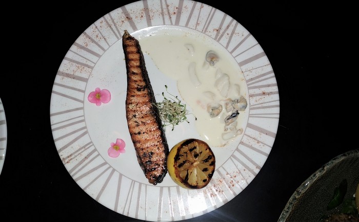 Четыре круглых говяжьих медальона, украшенные веточками кресс-салата и политые винно-вишневым соусом, весьма аппетитно и эффектно смотрелись на белой круглой тарелке. Мясо оказалось сочным и ароматным, гармонично сочетая в себе вкус специй и сладкой вишни. То же самое можно сказать и о стейке из лосося – в меру прожаренный, а в соединении жюльена из морепродуктов с выжатым лимонным соком - очень сочный и нежный.