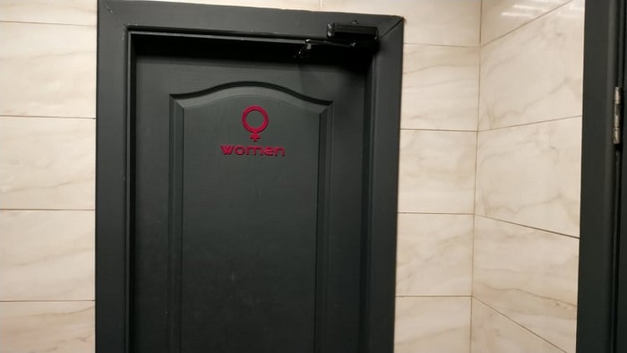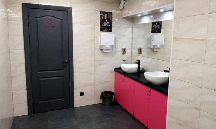 Отметим для наших читателей, что одним из основных минусов заведения - является уборная. Лишь одна кабина из 4-х в женском туалете подверглась современному ремонту и имеет унитаз, еще три в виде чаши Генуя - надо приседать на корточки, и в этом месте гость может почувствовать жесткий контраст между гламурным интерьером обеденных залов и отхожего места. В мужской туалет мы не заходили. На обоих туалетах есть надписи розового цвета «Man» и «Women», что в переводе «Мужчина» и «Женщины». В тоже время, клуб работает только несколько месяцев и возможно, вскоре ремонт в туалете состоится, либо же это задумка учредителей.