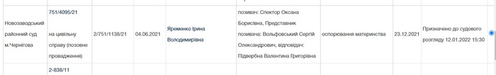 На 12 січня у Новозаводському райусуді м.Чернігів призначене засідання по справі №751/4095/21. В графі позивач на сайті «Судова влада України» значиться Спектор Оксана Борисівна, відповідачем вказана - Підвербна Валентина Григорівна (найстарша матір України), предмет спору - оспорювання материнства.