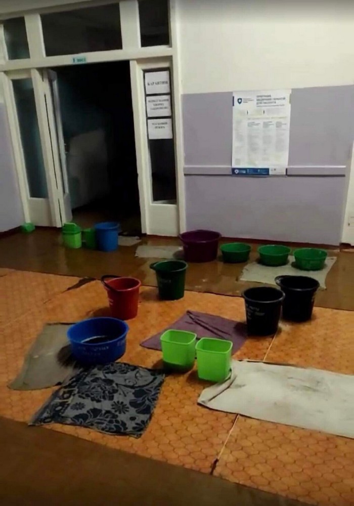 Щоб не пішла вода на перший поверх, де дитяче відділення, персонал хірургії тільки те й робить, що миє мокру підлогу та міняє тару, куди збирають воду. Але це проблему не вирішує.