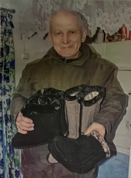 — Роботи з валянками багато, — говорить Микола Никанорович. — Якщо їх шити із шинелі, то попередньо її треба розпороти. Якщо ж вона сіра, ще й пофарбувати сукно, бо всі хочуть чорних валянок. Робили ми це влітку — фарбували сукно спеціальною фарбою для текстилю. Потім висушували і висмикували ті нитки, які не зафарбувались. Після цього викроювали заготовки на різні розміри, розкладали їх, настилали зверху вату, а на неї вже клали просту тканину або ватин і прошивали все це на машинці. Зазвичай Надя укладала всі ці шари, а я, коли був час, шив.