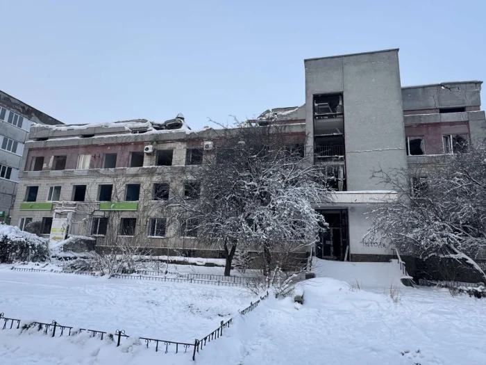 Будівля з білої цегли. Постраждала в березні 2022 року. Вибиті вікна, двері. Третій поверх напівзруйнований.