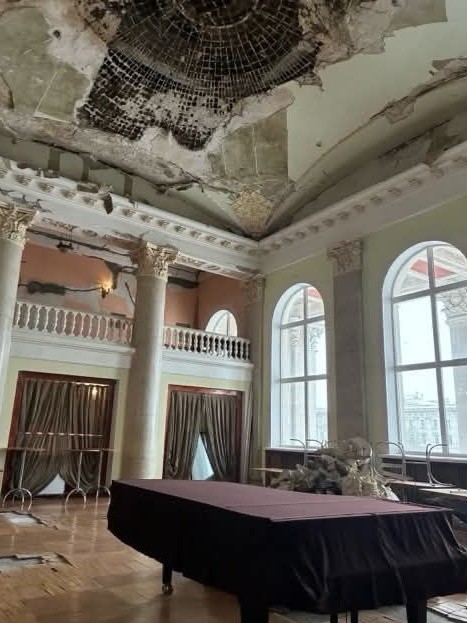 Усе-таки будівля фундаментальна. І вона, слава Богу, витримала. Тріщин багато. Вимушені були зняти люстру, яка теж пошкоджена. Але вона жива, ми її бережемо і рано чи пізно повернемо в глядацьку залу.