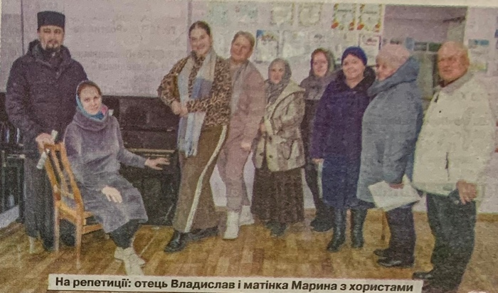 Він утворився завдяки ентузіастам, які бажали співати в церкві. Хтось це робив, коли вона ще входила в УПЦ (МП), і тепер захотів продовжувати. Долучилися й нові люди. Зараз у церковному хорі разом із регентом — дев'ять чоловік. Ми потрапили на одну з їхніх репетицій у місцевому Будинку культури. Займаються там, бо в церкві немає опалення і взимку всередині дуже холодно.