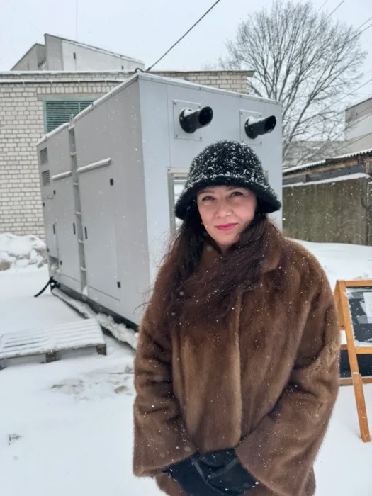 Олена Юрикова, голова ОСББ, біля генератора, що вмикають у блекаут