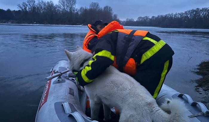 Фахівці човном припливли до тварини. Собаку обережно підняли на борт і доправили на берег.