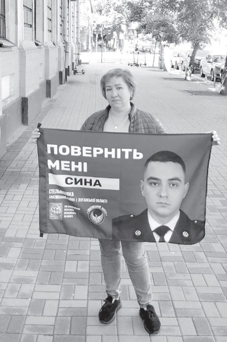 Ірина Сільченко виходить на акцію з полотном прапора прикордонників, на якому портрет її сина. І велике прохання матері: поверніть мені сина.