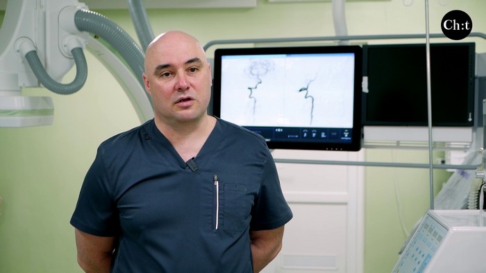 Таких операцій (тромбектомія, вилучення тромба) за рік зроблено 160 (за 2025 рік). А всього інсультів в області за рік — п’ять тисяч. Дуже велика кількість. Якщо брати ангіографії (дослідження судин) як хірургічне втручання — близько 800. Закриття аневризм — до 100 за рік. Стентування — розширення просвіту судин шиї (через атеросклероз або внаслідок травми) — десь 50-70 операцій. Це як нарости всередині судини. Бляшки, які поступово перекривають просвіт судини. Хвороба людей похилого віку.