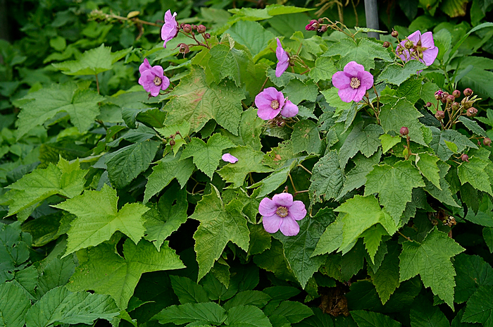 Мова йде про малину запашну, яку ще часто називають декоративною або малинокленом запашним (Rubus odoratus). Свою назву «малиноклен» рослина отримала через незвичайне листя, що за формою дуже нагадує кленове. На відміну від звичайної малини, ця красуня вкривається великими квітами, що нагадують дику троянду. Рослина невибаглива, чудово почувається в наших широтах і може стати ідеальною прикрасою для затінених куточків саду.