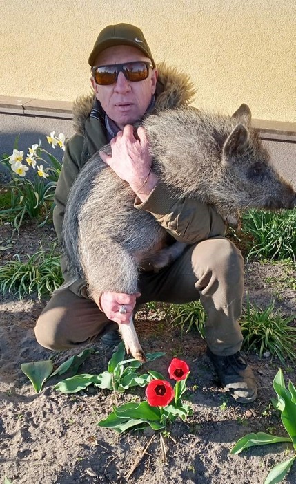 Якось повертаючись із чергового завдання, яке наші військові виконували у зоні бойових дій, у лісі підібрали крихітне дике поросятко. Хто знає, яка доля спіткала його матір разом з її смугастими дитинчатами?! Можливо, злякавшись вибухів та пострілів, самиця втекла, покинувши малечу напризволяще, або ж загинула, натрапивши на міну чи потрапивши під масований обстріл. Чи, може, мігруючи курськими лісами, поросятко само відстало від виводка – бо виглядало надто дрібним та слабким. Аби малюк не загинув на січневому холоді, бійці принесли його у розташування своєї частини. А коли незабаром через складну травму одного з їхніх побратимів, Віталія Глущенка, списували зі служби, вирішили віддати Віталію Миколайовичу малого знайду в якості прощального воєнного трофею. Так прямо у речовому мішку Віталій Глущенко й привіз поросятко додому у Селище Мринської громади на Ніжинщині.