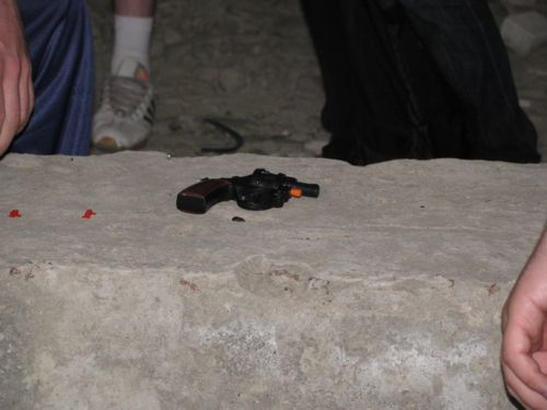 Понравилась игрокам и «Русская рулетка» с «гопарями», правда вместо настоящего револьвера использовали детские пистолеты, в народе называемые «пугачами». Патронов не было, но из-за отличной акустики в здании выстрел около уха был очень звонким и изрядно пощекотал нервы.