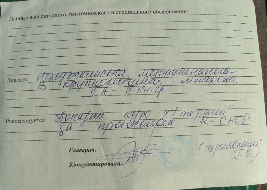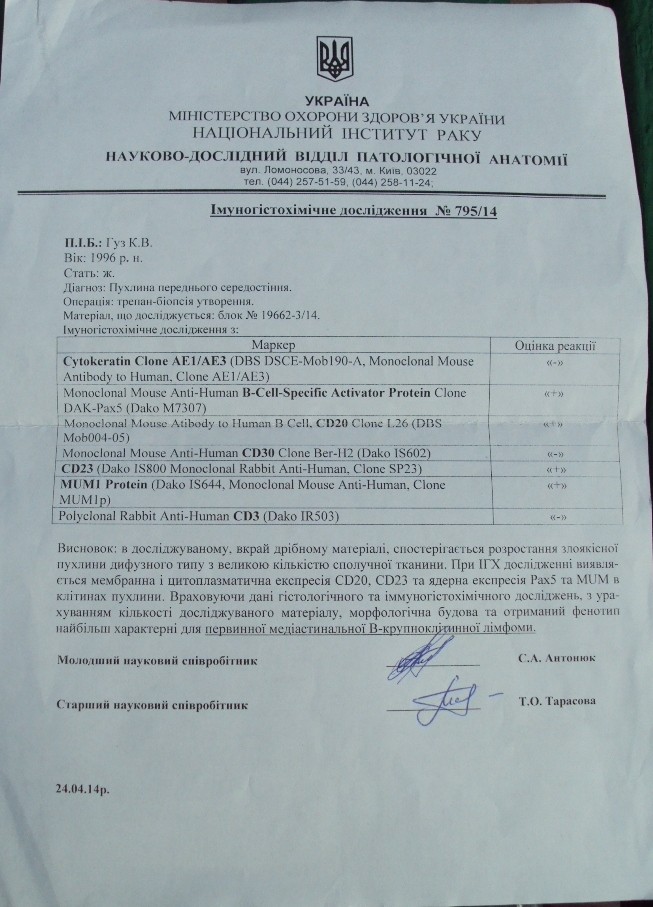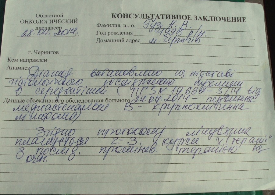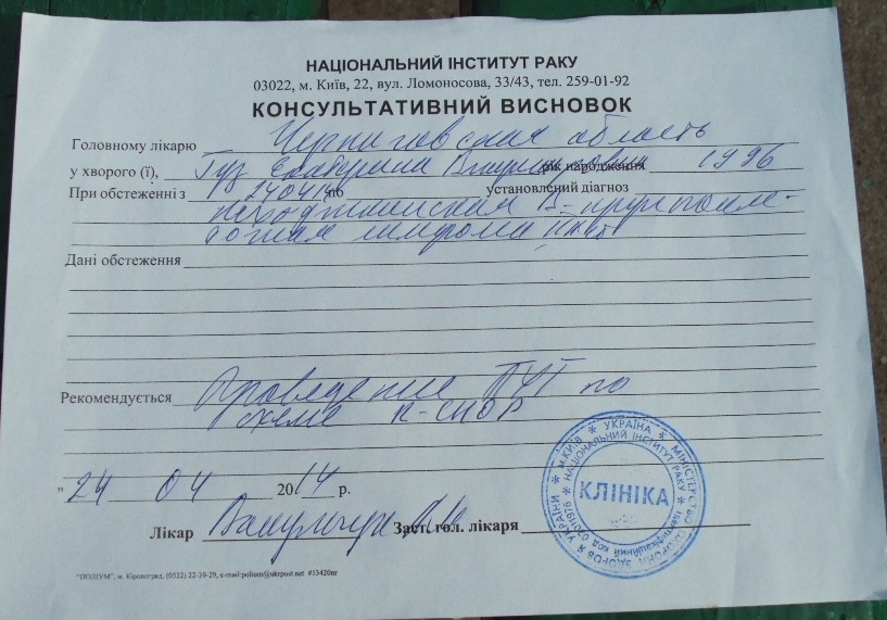 Катя учится на первом курсе Киевского национального университета имени Т.Г.Шевченко. В марте этого года Катя пожаловалась на боли в груди, по ее словам в области груди сильно пекло. Я сказала, чтобы она сделала флюорографию. Делала она ее в Киеве. Результат флюорографии показал какие-то затемнения. Поэтому Катя приехала в Чернигов, и мы поехали в онкологический диспансер. Там сделали повторную флюорографию. После того как врачи увидели результат они сделали еще один снимок. С результатами нас направили к хирургу. Хирург предварительно сказал, что необходимо делать химиотерапию и операцию. А затем направил Катю на КТ. После результатов КТ нам посоветовали обратиться в Национальный институт рака в Киеве и обследоваться там. Примерно в течение месяца Катя сдавала анализы в Киеве. Уже там врачи окончательно озвучили диагноз: лимфома правого легкого 2-й стадии.