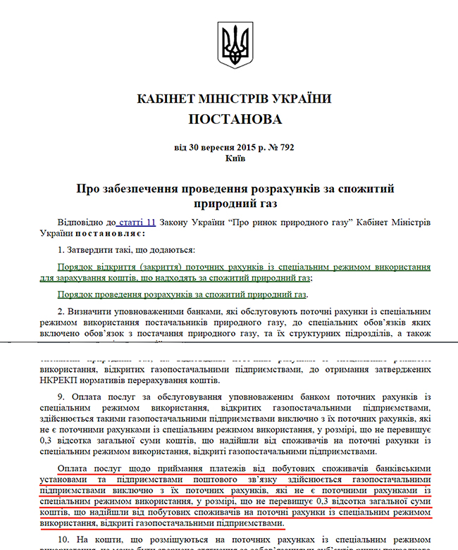 По мнению представителя ООО «Черниговгаз Сбыт» проблема связана с тем, что в сентябре текущего года Арсений Яценюк подписал Постановление № 792 «Про забезпечення проведення розрахунків за спожитий природний газ», которое определяет, что «оплата услуг по приему платежей от бытовых потребителей банковскими учреждениями и предприятиями почтовой связи осуществляется газоснабжающими предприятиями исключительно из их текущих счетов, которые не являются текущими счетами со специальным режимом использования, в размере, не превышающем 0,3 процента общей суммы средств, поступили от бытовых потребителей на текущие счета со специальным режимом использования, открытые газоснабжающими предприятиями».