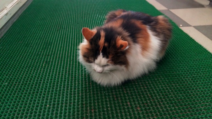 На пороге нас встречает пушистая упитанная трехмастная кошка. Не просыпаясь, она дает себя почесать за ушком и миролюбиво мурлычет. Ее подружка такой же расцветки, но короткошерстая устроилась возле батареи в комнатке вахтера и с царственным видом взирает на посетителей.