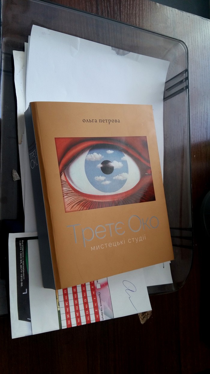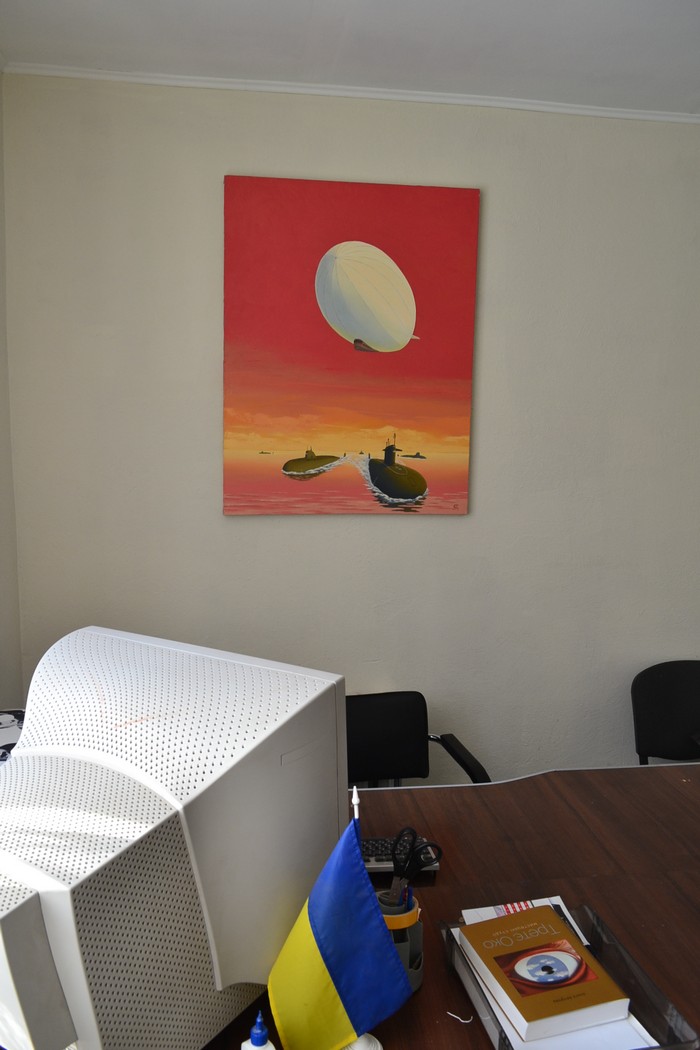Кабинет Сергей делит с еще одним помощником Бориса Дедова - Татьяной Манойлик. На рабочем столе заместителя директора «Пласт-Арта» массивный компьютерный монитор старого образца, принтер с распечаткой афиши текущей фотовыставки «Серия «38», керамическая чайная кружка с желтым зайчиком, в пластиковой папке для бумаг книга Ольги Петровой профессора Киево-Могилянской академии «Третє око». Книга о том, как формировалось современное украинское искусство, ретроспектива, истоки. Над черным замдиректорским креслом висит картина Тонканова "Над вечным беспокойством". На ней на фоне заката изображены, плывущие по морю подводные лодки, а над ними – белый дирижабль. Противоположную стену украшает работа Петра Лебединца «Желание».