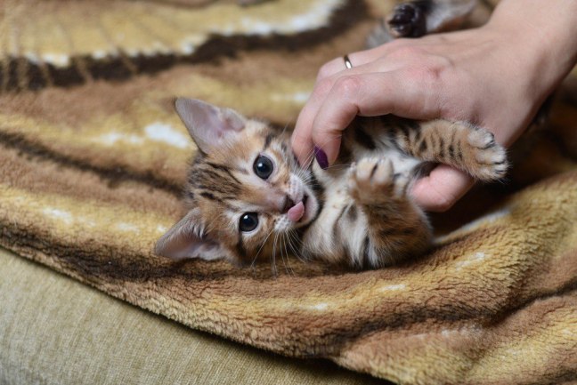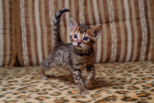 - Когда выбираешь котенка, нужно взять игрушку какую-нибудь и с ним поиграть, чтобы понять здоров ли он, насколько активен, способен ли играть. Второе — посмотреть на живот: у бенгалов если это брак, могут быть белые пятна. Нужно также всегда проверять хвост — накручивать, а если он не закручивается, то это возможно проблемы с позвоночником. Обычно это врожденное и исправить уже нельзя.