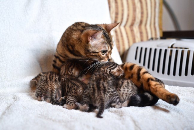 - Да нет никаких проблем, по крайней мере у меня никогда не было. Я знаю что котята могут неправильно лежать, сложные роды придется делать или даже кесарево. Ведь котята у бенгальцев крупные. Для того чтобы этого не было я стараюсь не перекармливать свою кошку. А она когда беременна ест всегда, когда ей дашь, когда хочет и когда не хочет.