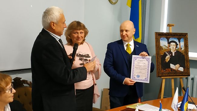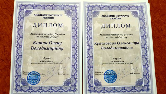 Президент ВГО «Академія нотаріату України» Володимир Черниш повідомив присутніх, що рішенням президії АНУ №2 від 17.09.2018 року Олександра Володимировича Красногора та Олену Володимирівну Котик обрано академіками Академії нотаріату України та вручив кращим нотаріусам дипломи про присвоєння цього почесного звання.