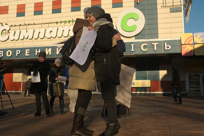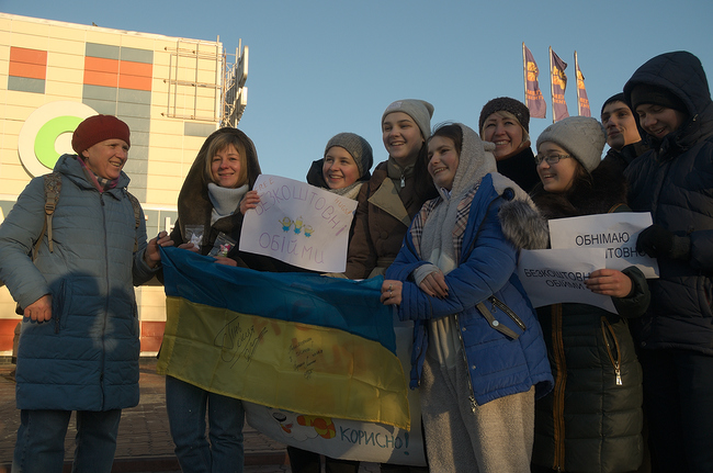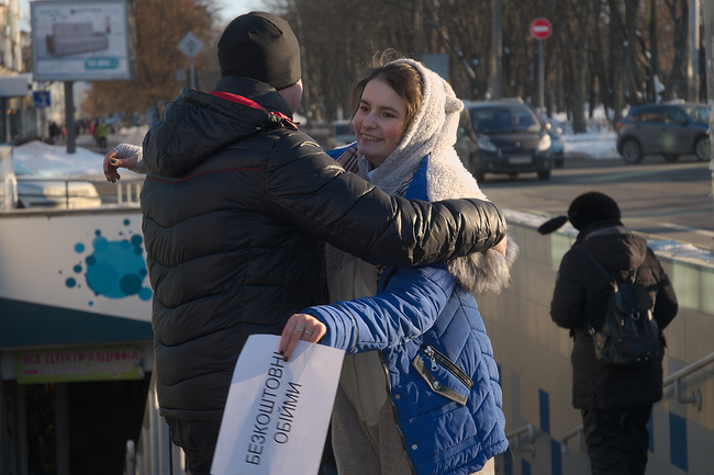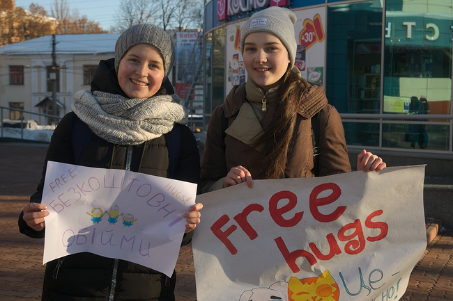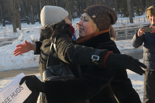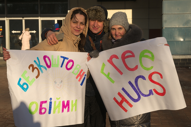 Группа из молодых ребят и девушек собравшихся на площади возле ТРЦ «Мега Центр», взяв в руки плакаты «Безкоштовні обійми» и «Free Hugs», за короткое время умудрились зарядить прохожих позитивными эмоциями и хорошим настроением.